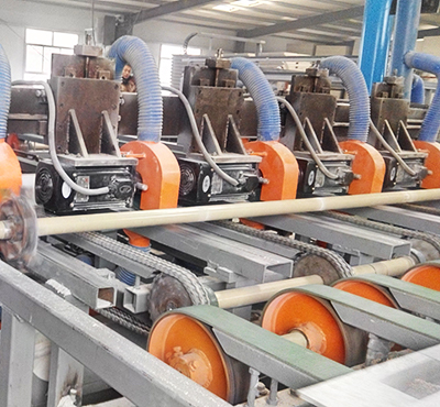 8.定尺系統(tǒng):此系統(tǒng)由縱切鋸,加速輥道,橫切鋸及接板平臺(tái)組成。表面處理后的板材經(jīng)過此系統(tǒng),達(dá)到客戶最終的尺寸要求。在接板平臺(tái)處驗(yàn)板后,進(jìn)入倉庫打包代售。